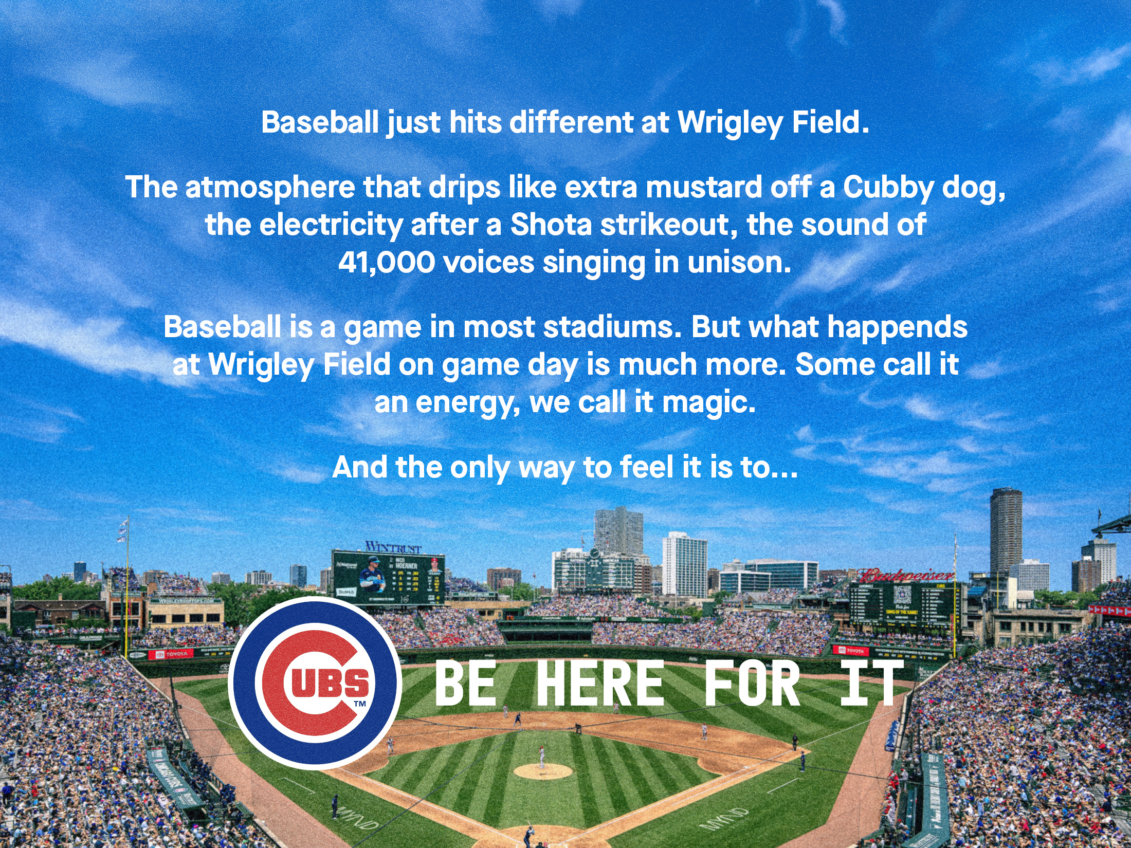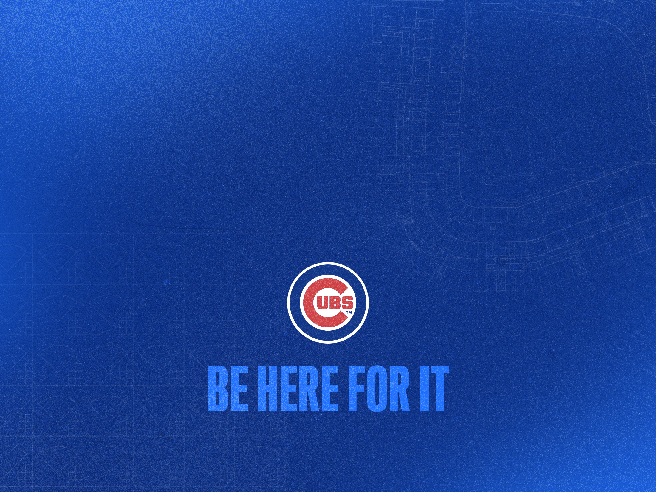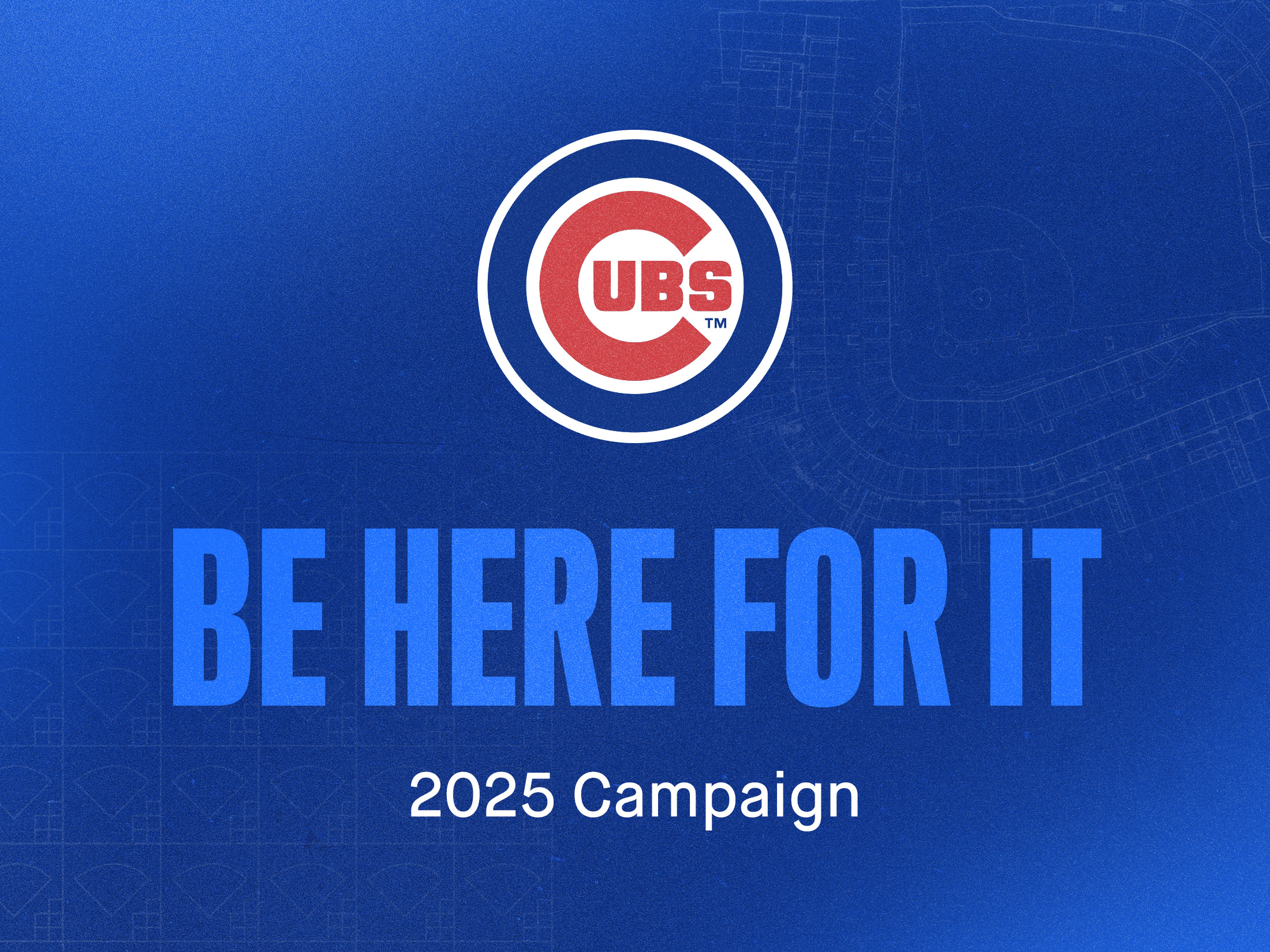 The bright blue color was brought in to evoke the excitement and energy of the campaign. Blueprints of Wrigley Field and scorecard pattern elements were created to reinforce the slogan of the campaign, “Be Here For It”, to visually represent a presence at the ballpark. Blurred text and gradients added dimension, interest, and movement, implying pausing for a moment in time — in order to really be present, be excited, and “Be Here For It”.