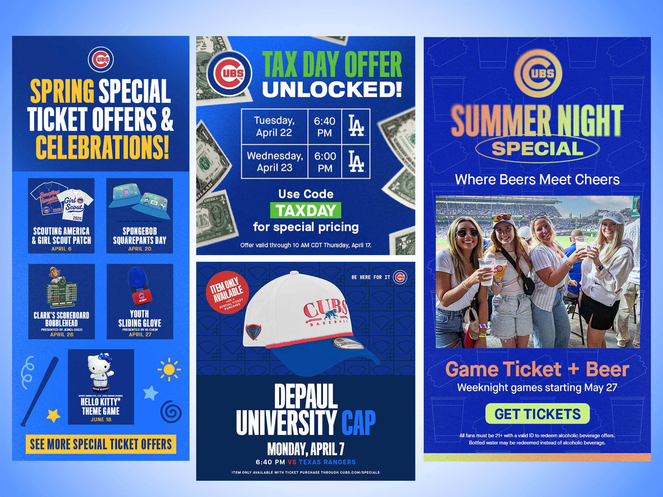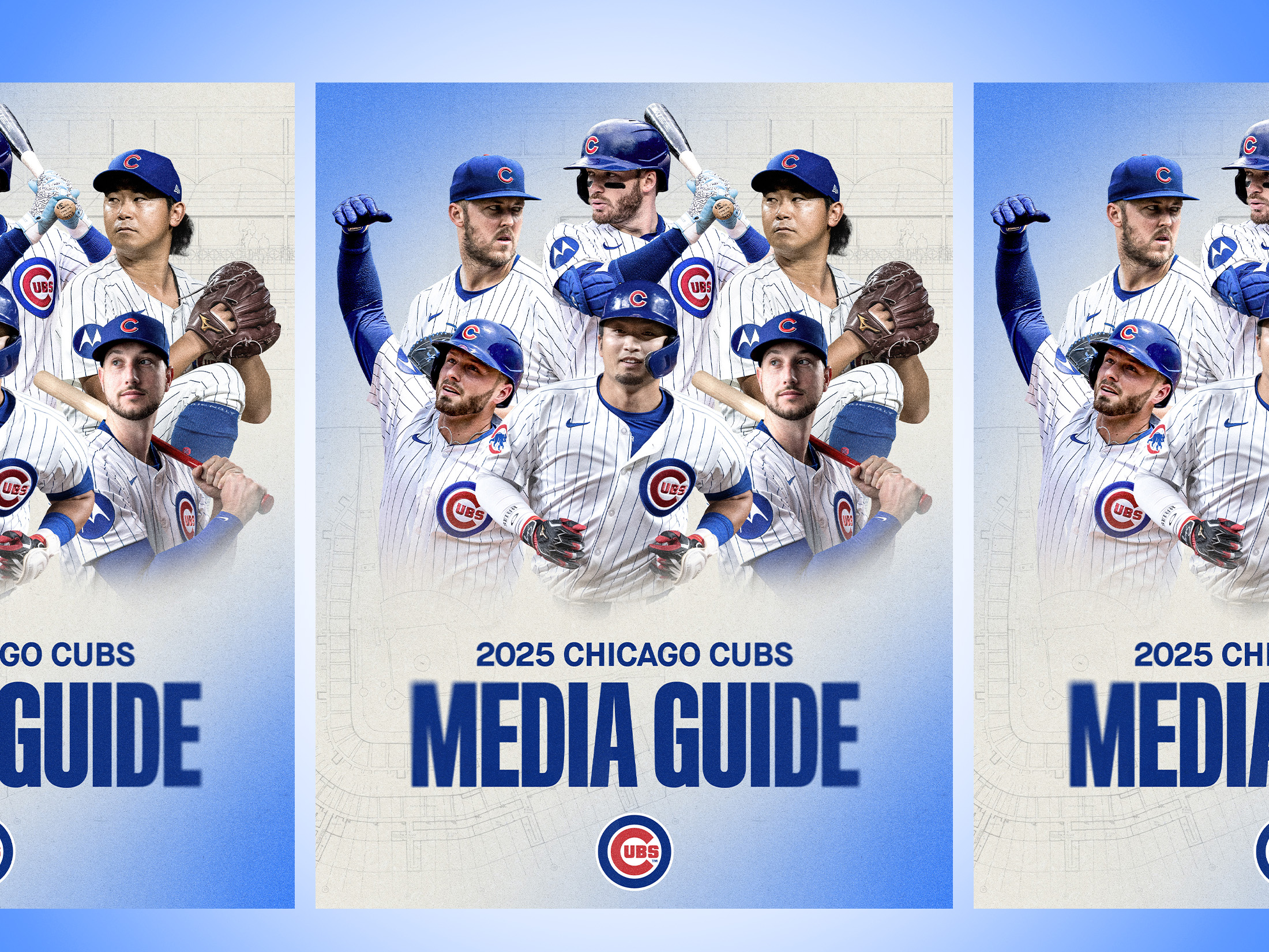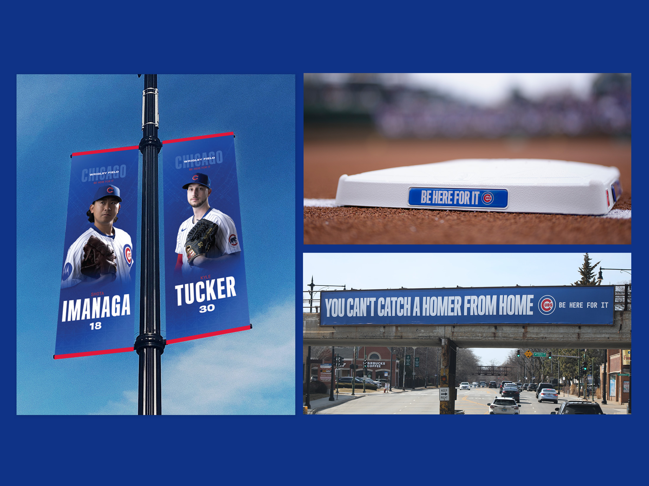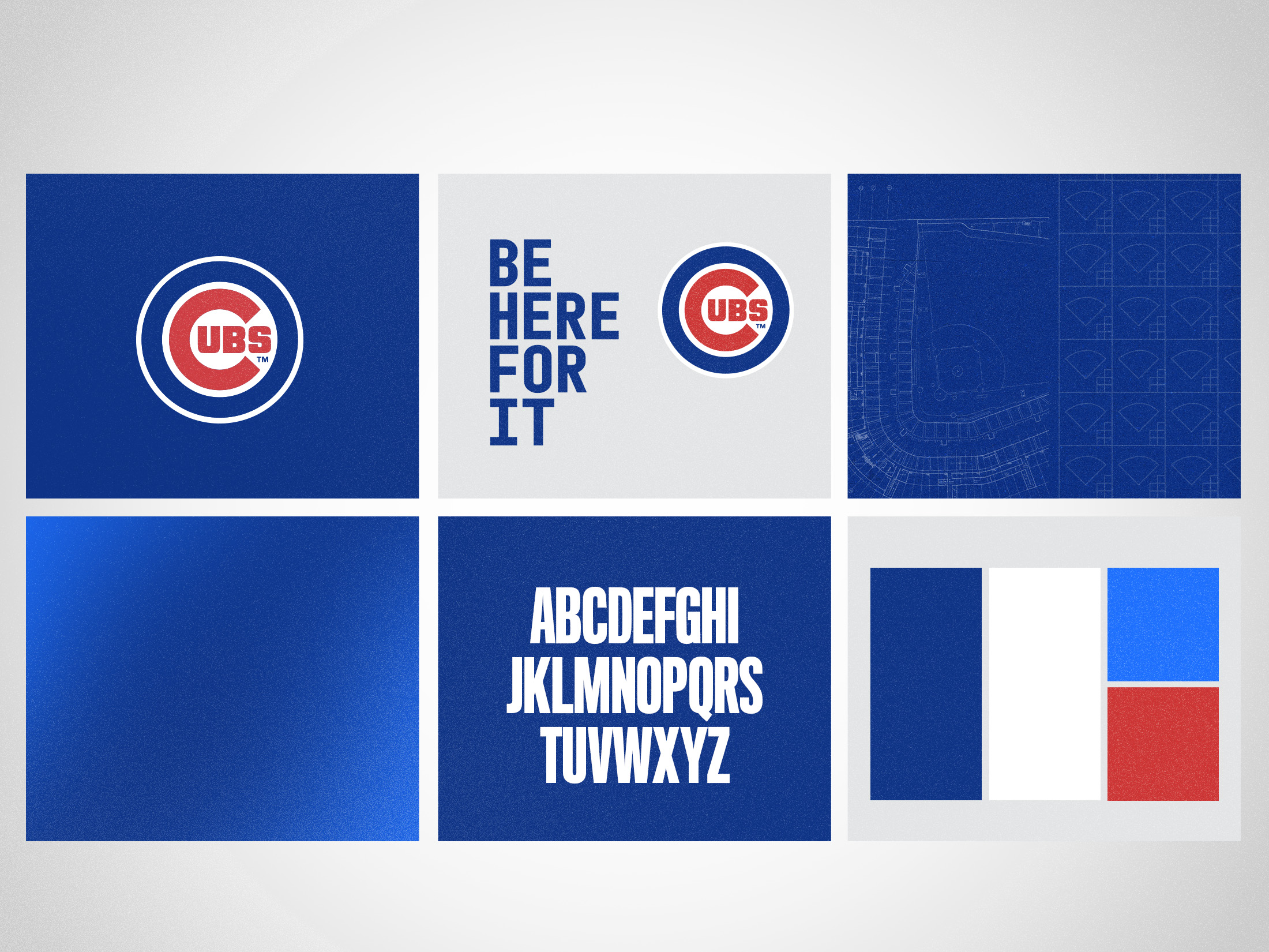 The bright blue color was brought in to evoke the excitement and energy of the campaign. Blueprints of Wrigley Field and scorecard pattern elements were created to reinforce the slogan of the campaign, “Be Here For It”, to visually represent a presence at the ballpark. Blurred text and gradients added dimension, interest, and movement, implying pausing for a moment in time — in order to really be present, be excited, and “Be Here For It”.
